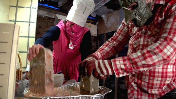 With MUSH we get the real deal of cheap food, which is “bubbling” in the bowls as Chef Pink Face (Broich) and his assistant Roy (Eli Elliott) mash the solids together with large bricks they find on the ground in the dilapidated shed where the performance takes place.