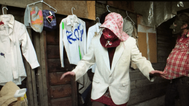 In the second installment of video performance directed by Kelly Broich with Eli Elliott and Brad Kaup, comes FASHION, a surreal absurdity focusing on Pink Face’s obsession with making money through the creating of high priced “designer” garments. The garments are taken through various techniques  devised by Pink Face to provide “added value”. Pink Face cuts clothing, repairing them with neon duct tape (“rip and repair”) while assistant Roy applies sandpaper to shirt collars to “distress” the garment further. The result is clothing that goes from $10 retail to now being able to confidently place them at values in the several hundreds.